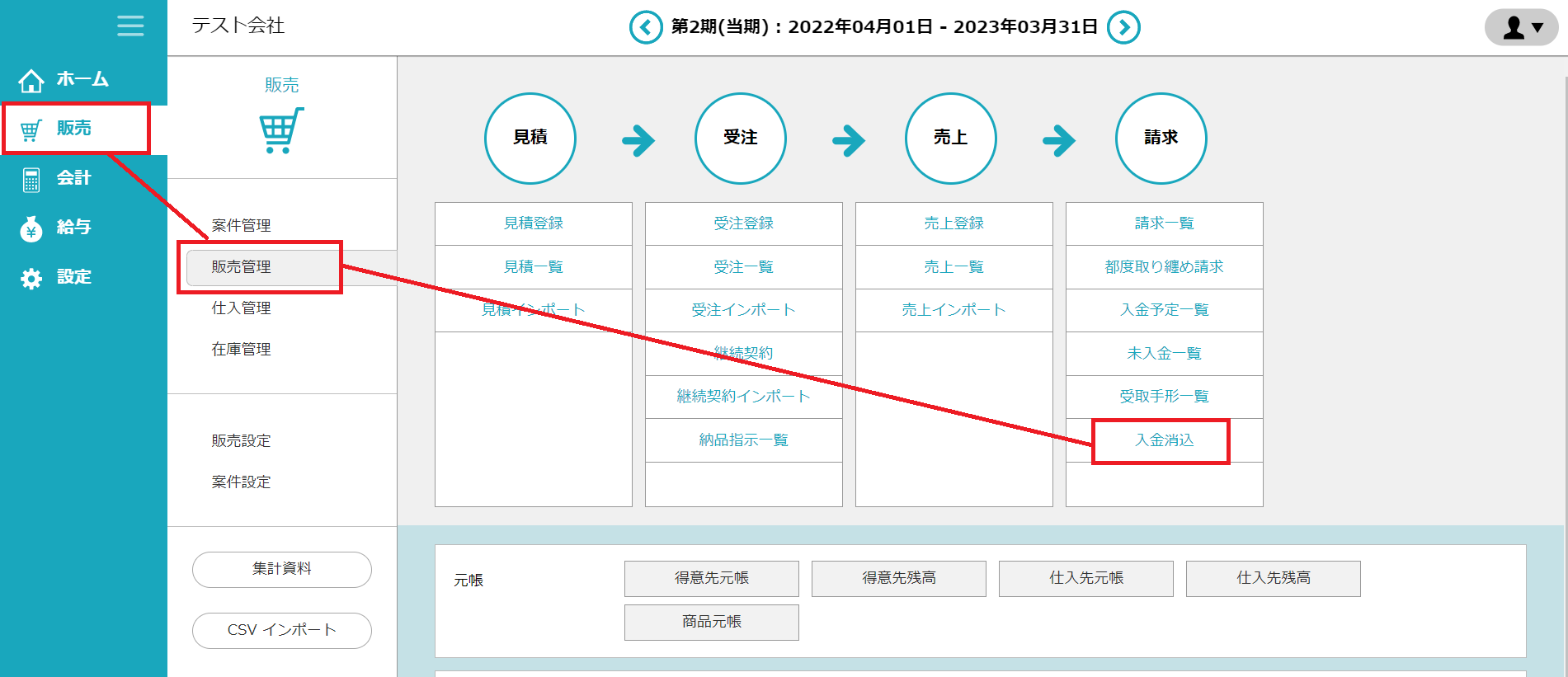 ①「販売」>「販売管理」>「入金消込」にアクセスします。