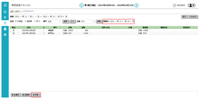 承認対象をチェックボックスで選択し、「承認」ボタンをクリックします。